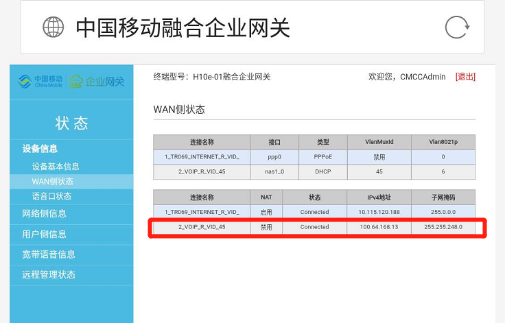 WAN口侧状态-查看45通道获取到语音IP