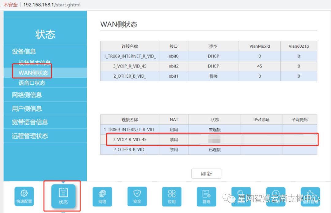 语音必须接入IMS专网(接在ONU下面透传45VLAN),状态里面3_VOIP_R_VID_45链接会获取到100开头的IP地址,如果未获取请到协调ONU厂家开通
